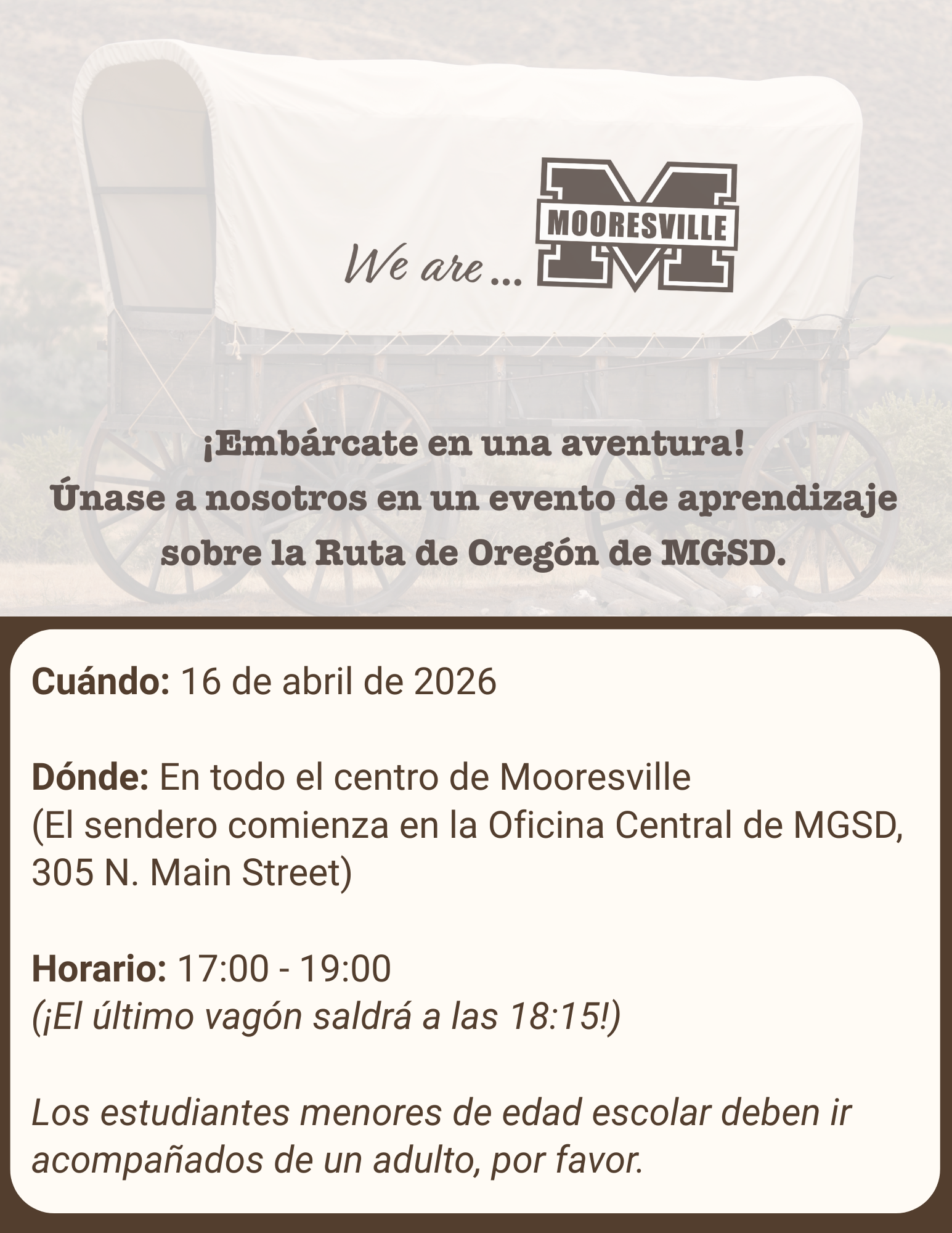 Join us for a one-of-a-kind learning event that blends education with adventure as we journey through the footsteps of the brave pioneers who trekked westward in search of new opportunities and a better life. Your journey will start in Independence, Missouri (aka MGSD Central Office, 305 N Main) and take you throughout the wild west of Downtown Mooresville fighting hunger and disease until you make it to Willamette Valley in Oregon (...that would be the little park with the big 250 statue at the corner of McLelland and Main). Please read through the important details below and then RSVP putting in the notes if you know approximately what time you plan on starting your journey. ย If you aren't sure, that is perfectly fine. Life on the Oregon Trail in the 1800s was a bit unpredictable! ย We kindly ask that an adult accompany any children younger than high school age. ย
